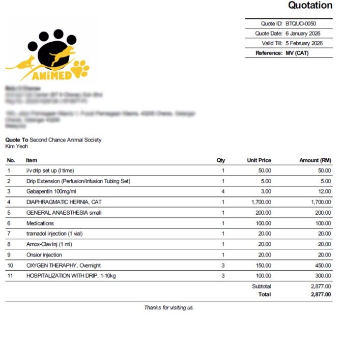 MV is a young female cat (estimated 1–2 years old) who has already endured more trauma than most cats face in a lifetime. Rescued from Mid Valley Mall loading bay on 29 July 2025, MV came to us injured, frightened, and in pain — with a pelvic fracture that suggested she had been hit by a vehicle.